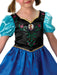 - Bodice is satin with digitally printed character motif and floral designs in glittery patterns plus gold trim
