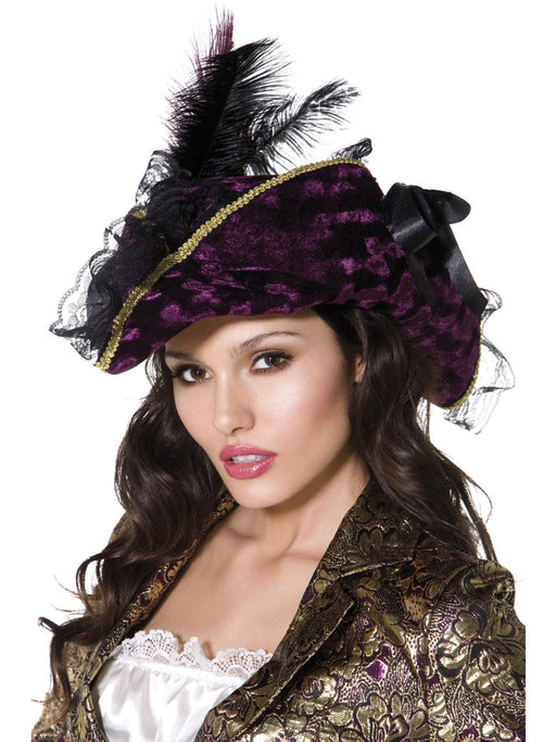 Ahoy glam captain! This purple velvet pirate hat is for the swashbuckler who prefers champagne over rum. With lush feathers, gold trim, and sassy r...