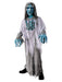 This haunting outfit features a long grey tunic under a tattered white robe, gruesome 3D skeletal chest, eerie blue cracked-face mask, and oversized monster gloves.